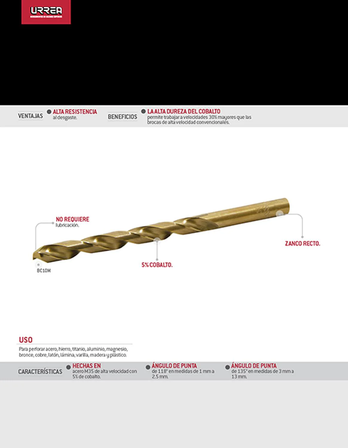 -La alta dureza del cobalto permite trabajar a velocidades 30% mayores que las brocas de alta velocidad convencionales.