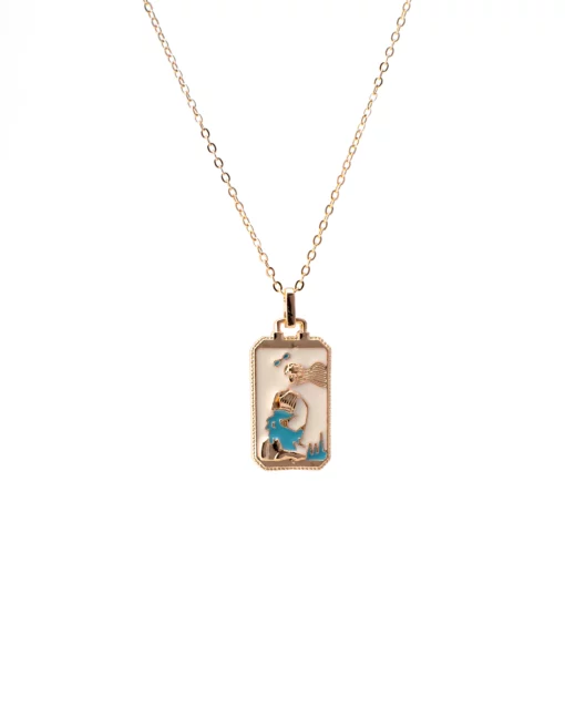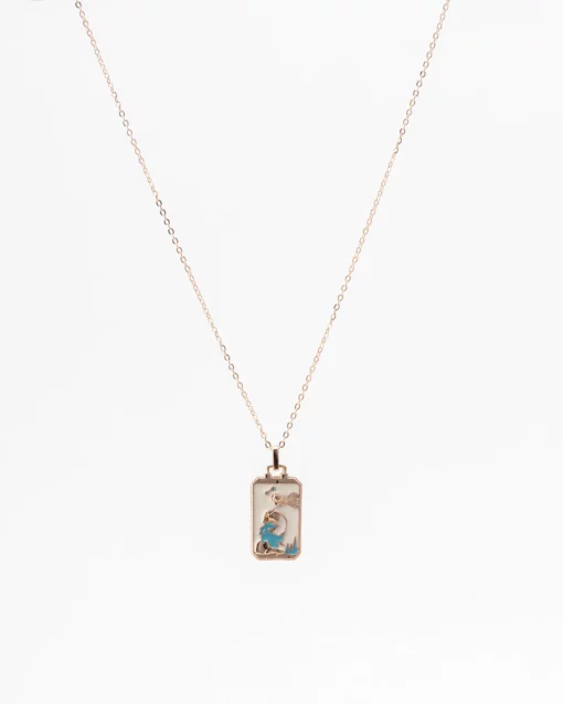 Collar dorado con un dije rectangular en tonos neutros con detalles dorados, que destaca por su dije de tarot.