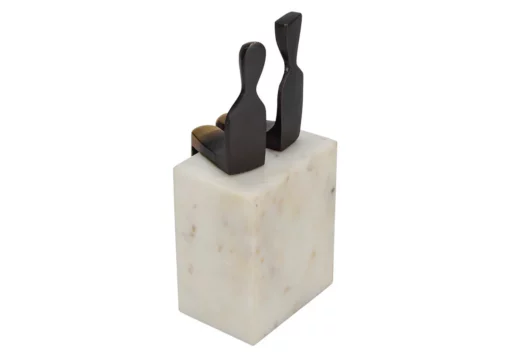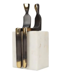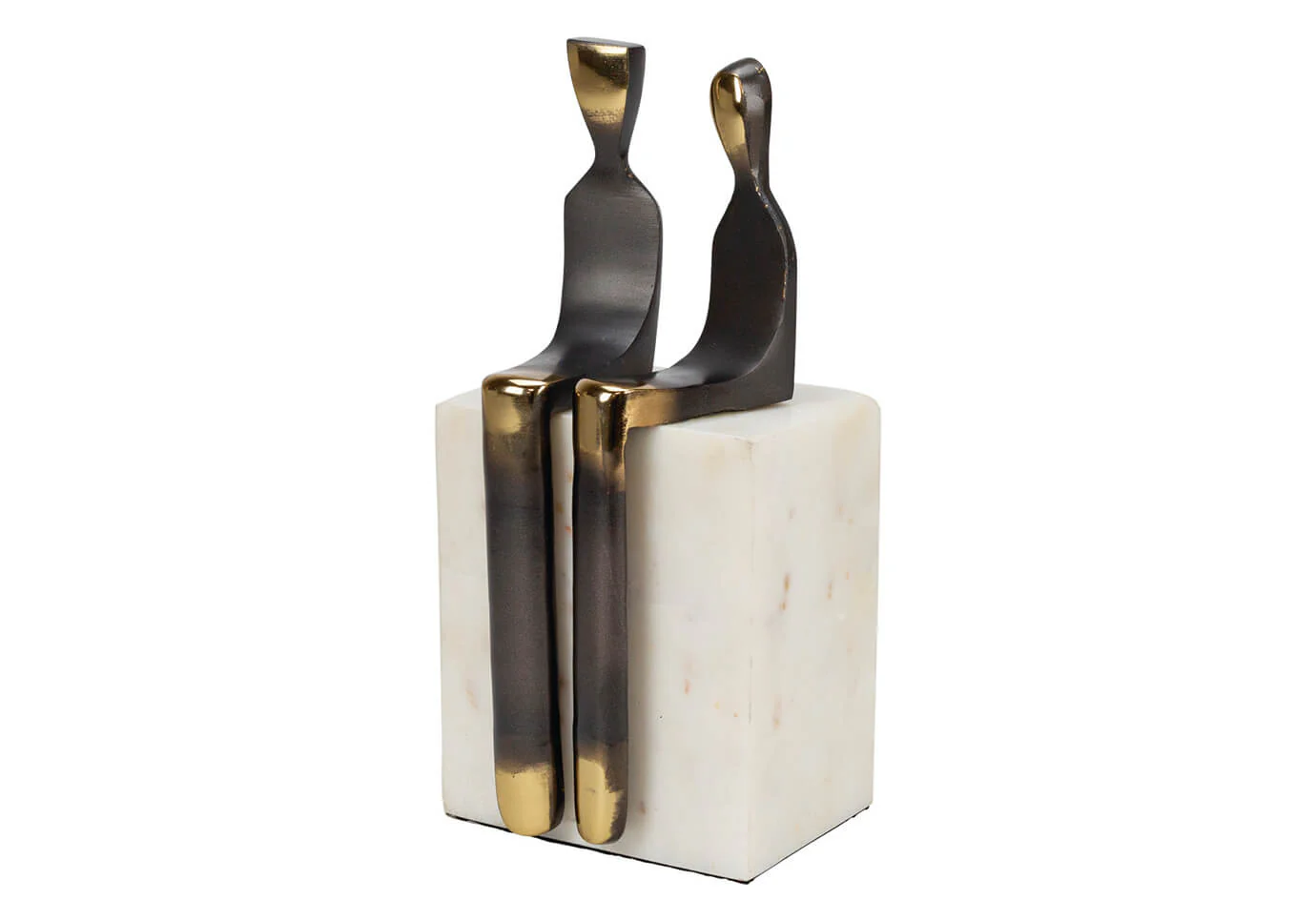 Escultura de pareja hecho de metal detalles dorado pulido sentados en bloque de mármol blanco