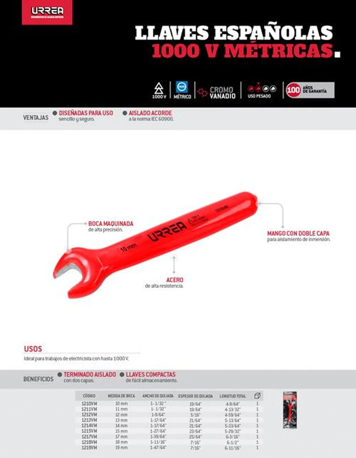 -Medida de boca: 12. Longitud total: 4 59/64″. -Ancho de quijada: 1 9/64″. Terminado: aislado con dos capas.-Espesor de quijada: 5/16″.-Material del mango: Aislamiento de inmersión de plástico de doble capa.-Hechas en cromo vanadio.-Ideal para trabajos de electricista con hasta 1000V.
