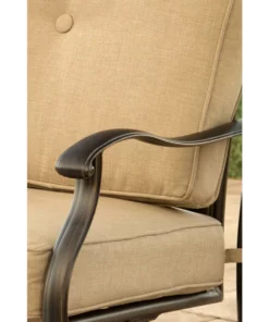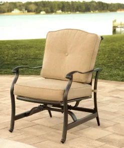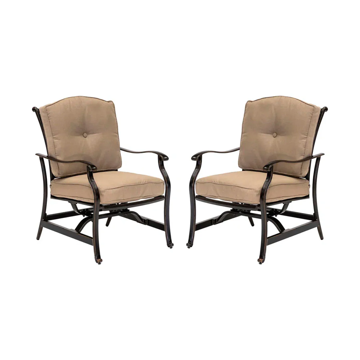 - Agregue a su oasis al aire libre estas dos mecedoras acolchadas y de asientos profundos.