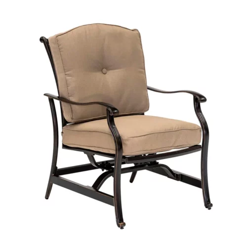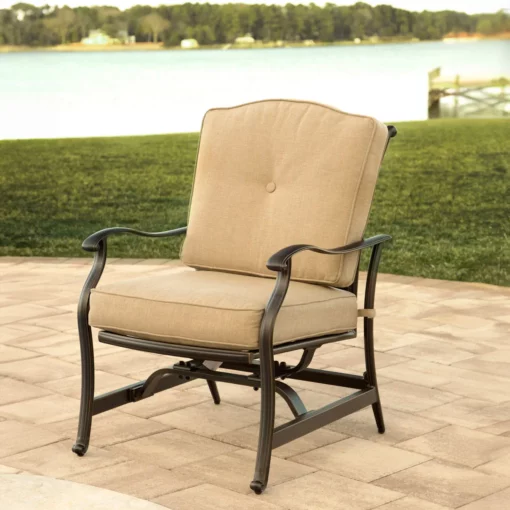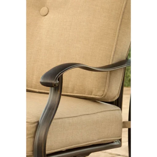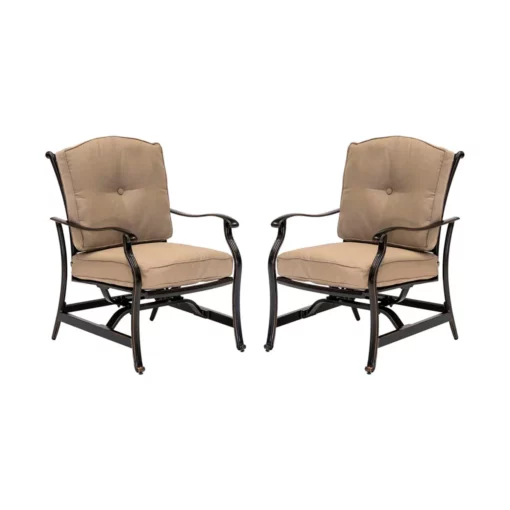 - Agregue a su oasis al aire libre estas dos mecedoras acolchadas y de asientos profundos.