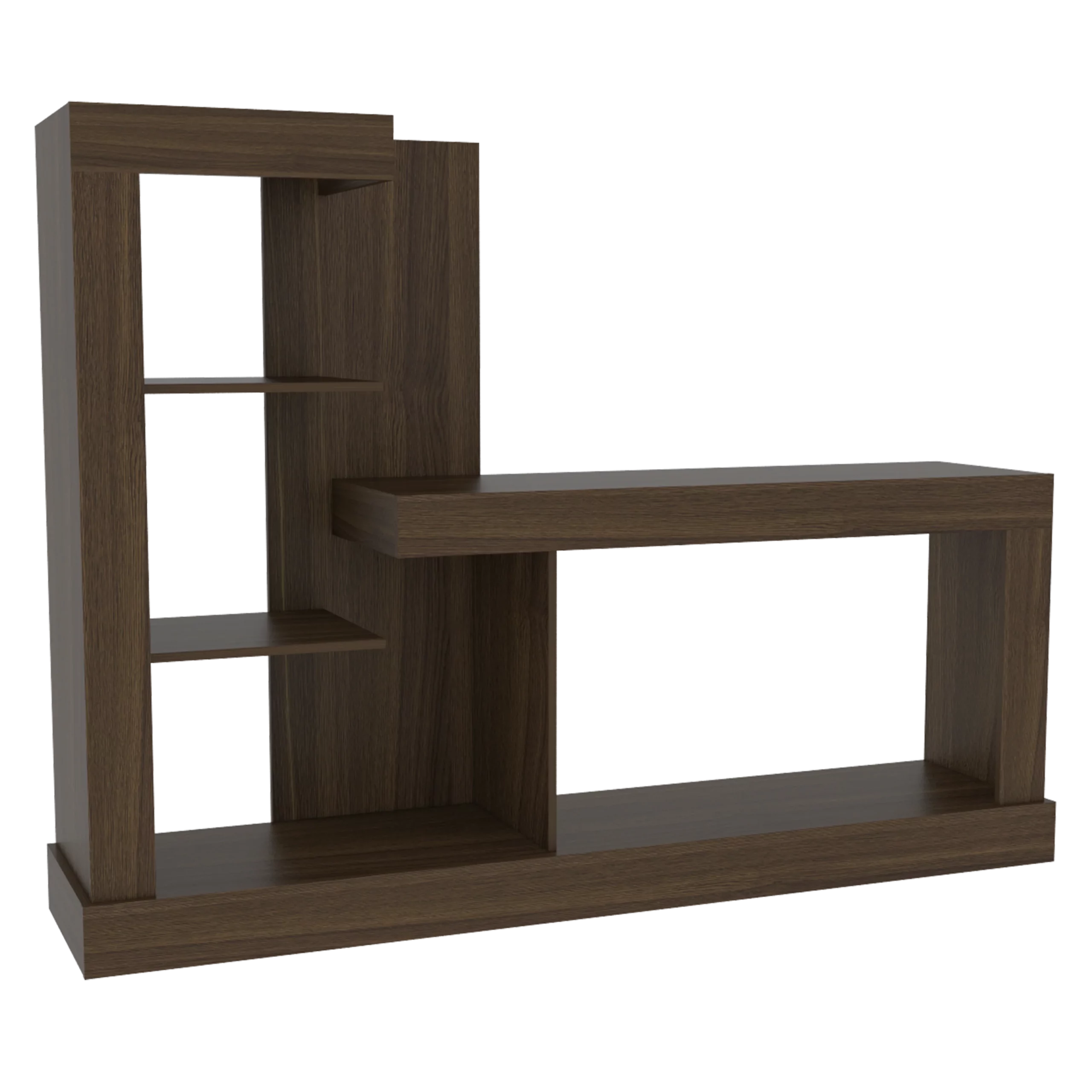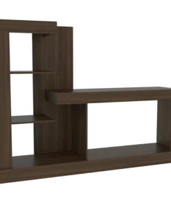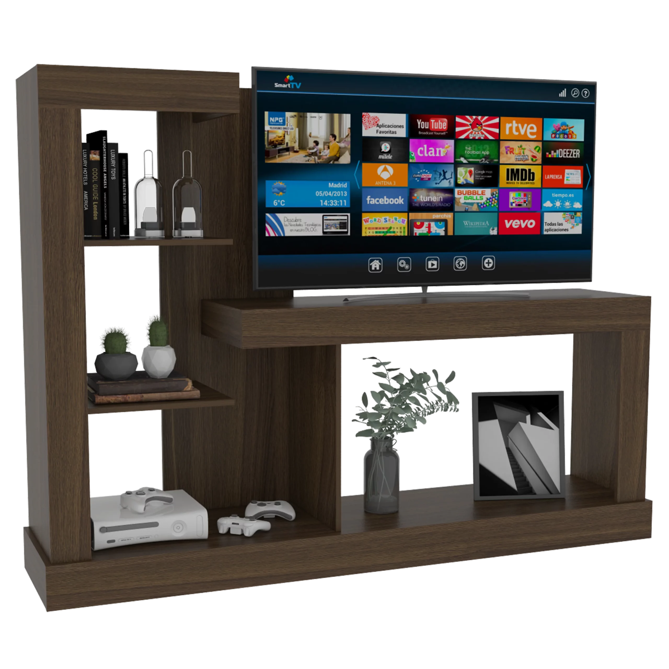 Mesa para TV, con espacio para televisor de hasta 55 pulgadas máximo, diseño moderno con combinación de colores y múltiples entrepaños y superficies para ubicar objetos.