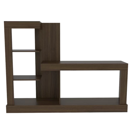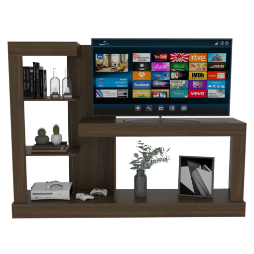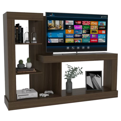 Mesa para TV, con espacio para televisor de hasta 55 pulgadas máximo, diseño moderno con combinación de colores y múltiples entrepaños y superficies para ubicar objetos.