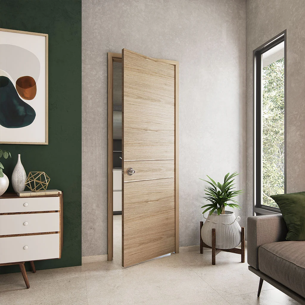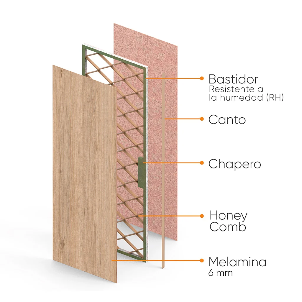 Puerta de madera melaminica ranurada sin marco veta horizontal color rovere marca Galantti. Elaborada en aglomerado melaminico de 6 mm estándar con una estructura interna en aglomerado RH e interior en honey comb. Tiene un grosor de 36 mm y está diseñada para interiores como puerta de baños, alcoba, vestier y divisiones de espacio.Incluye puerta sin marco, 4 bisagras( HBP444-01)+ cerradura( HCP587-01). No incluye tapaluces y perforación de la cerradura. El marco debe ser comprado por separado. NOTA IMPORTANTE: Las dimensiones de la puerta son entre marco y marco y de piso a marco superior