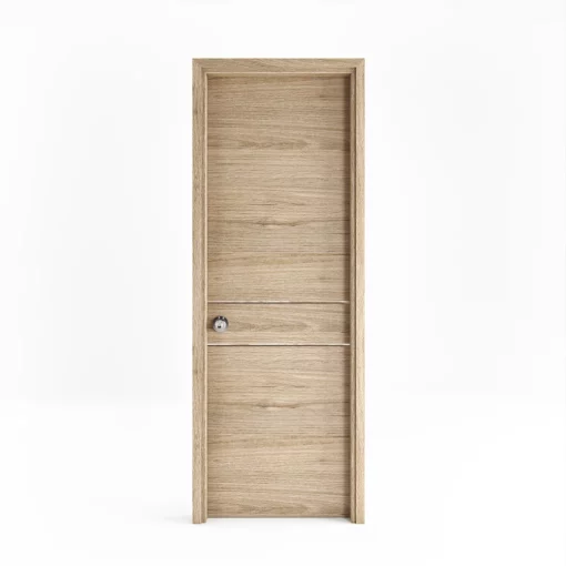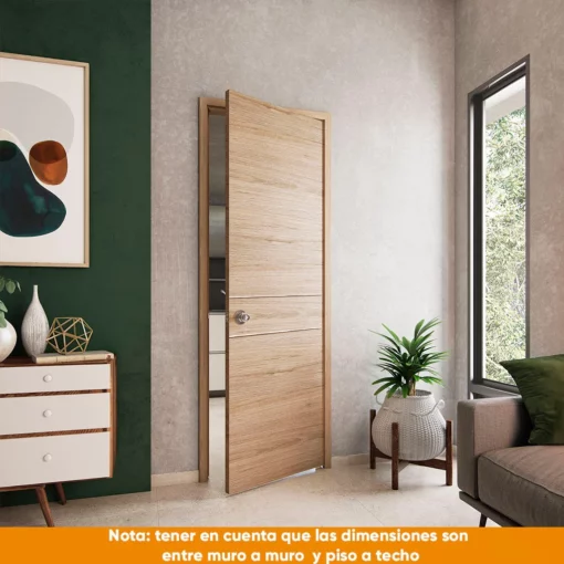 Puerta de madera melaminica ranurada sin marco veta horizontal color rovere marca Galantti. Elaborada en aglomerado melaminico de 6 mm estándar con una estructura interna en aglomerado RH e interior en honey comb. Tiene un grosor de 36 mm y está diseñada para interiores como puerta de baños, alcoba, vestier y divisiones de espacio.Incluye puerta sin marco, 4 bisagras( HBP444-01)+ cerradura( HCP587-01). No incluye tapaluces y perforación de la cerradura. El marco debe ser comprado por separado. NOTA IMPORTANTE: Las dimensiones de la puerta son entre marco y marco y de piso a marco superior