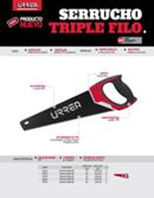 MARCA: Urrea DESCRIPCION DEL PRODUCTO: -Hoja de acero de 18 pulgadas.-Dientes de triple filo.-Mango bimaterial.-7 dientes por pulgada.-Espesor de hoja de 85 mm.-Serrucho para cortes en madera, plástico, PVC y tablaroca. ESPECIFICACIONES TECNICAS: CONTENIDO DEL PAQUETE: Serrucho. GARANTIA: 1 año ALTO EN CM: 9.5 LARGO EN CM: 32.5 FONDO EN CM: 12 PESO EN KG: 3.34